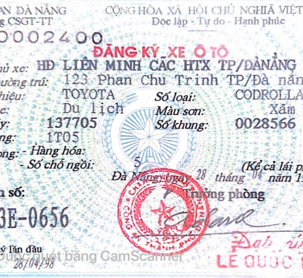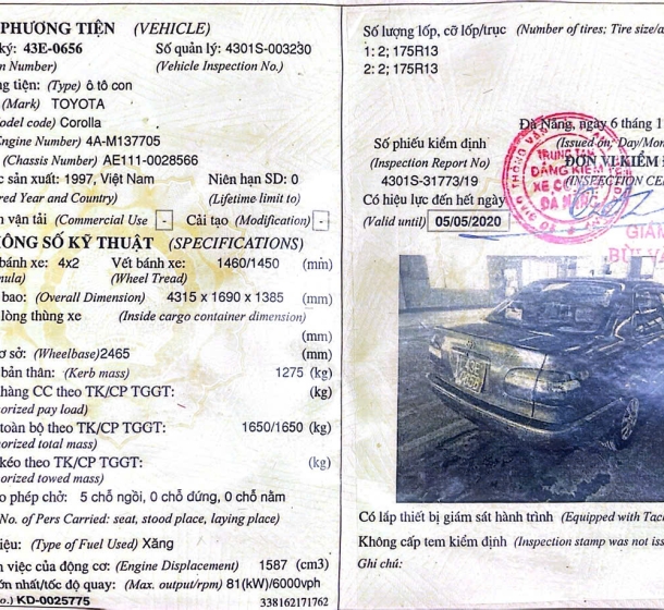 Tài sản 19: 01 (một) xe ô tô đã qua sử dụng nhãn hiệu TOYOTA; số loại: COROLLA, biển kiểm soát số: 43E-0656; số chỗ ngồi: 05 chỗ; màu sơn: Xám; năm/nước sản xuất: 1997/Việt Nam; số khung: AE111-0028566; số máy: 4A-M137705 theo Giấy Chứng nhận đăng ký xe ô tô số A 0002400 do Phòng CSGT-TT Công An Đà Nẵng cấp ngày 28/04/1998 đứng tên HĐ LIÊN MINH CÁC HTX TP/ĐÀ NẴNG.