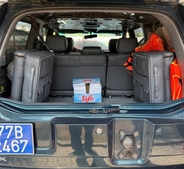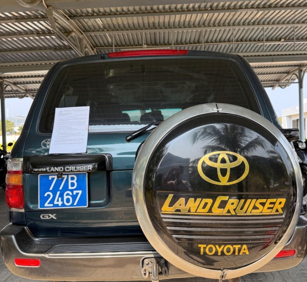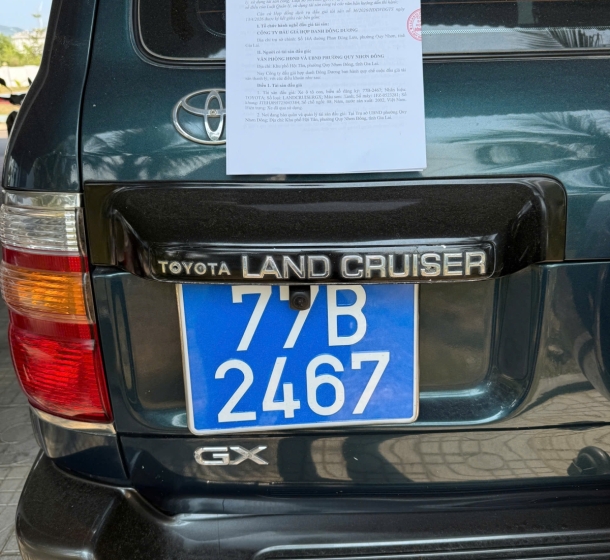 Xe ô tô con, biển số đăng ký: 77B-2467; Nhãn hiệu: TOYOTA; Số loại: LANDCRUISERGX; Màu sơn: Xanh; Số máy: IFZ-0523281; Số khung. TEHJ09J725045384, Số chỗ ngồi: 08; Năm, nước sản xuất: 2002, Việt Nam. Hiện trạng. Xe đã qua sử dụng.